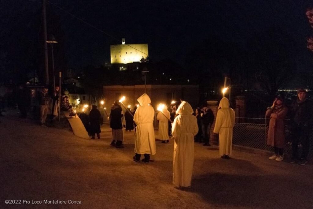 Un borgo illuminato dalle fiaccole, la discesa di Gesù dal Golgota e la deposizione del corpo nel Sacro Sepolcro, queste sono le suggestioni del Venerdì Santo a Montefiore Conca. Uno spaccato della Gerusalemme di duemila anni fa, con i suoi protagonisti del tempo, la Madonna, gli apostoli, ma anche Ponzio Pilato e i membri delle confraternite con le loro cappe bianche e nere, per finire con gli angioletti che recano i simboli della passione di Cristo.
